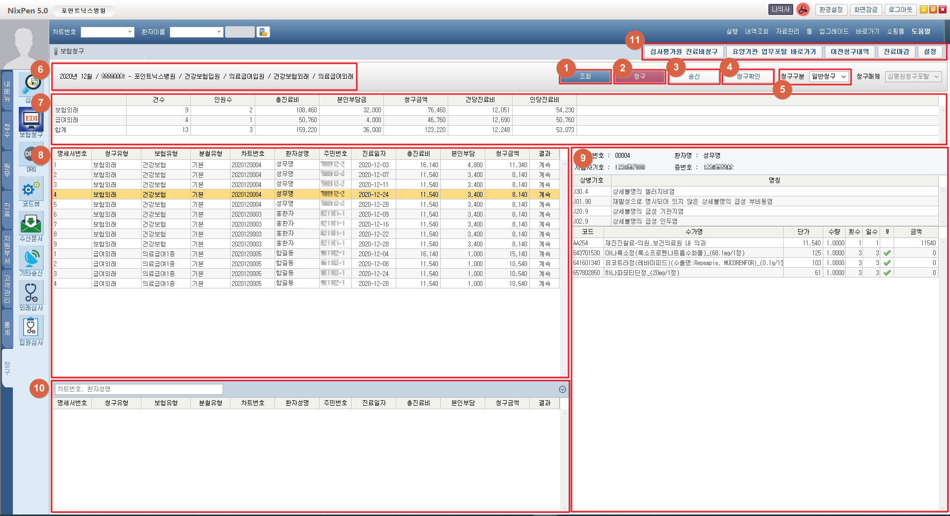 ① 보험청구 대상을 조회합니다. ② 조회된 명세서를 기준으로 청구를 진행합니다. ③ 마지막으로 생성된 청구데이터를 기준으로 청구송신을 수행합니다. ④ 이전에 생성된 청구데이터 목록을 확인합니다. ⑤ 청구구분을 선택합니다. ⑥ 청구조회 기준을 표시합니다. ⑦ 청구 대상 합계를 표시합니다. ⑧ 명세서 목록을 표시합니다. ⑨ 선택한 명세서의 진료 정보를 표시합니다. ⑩ 특정 환자의 명세서를 검색합니다. ⑪ 각 기능을 사용할 수 있습니다. 1. 보험청구 화면