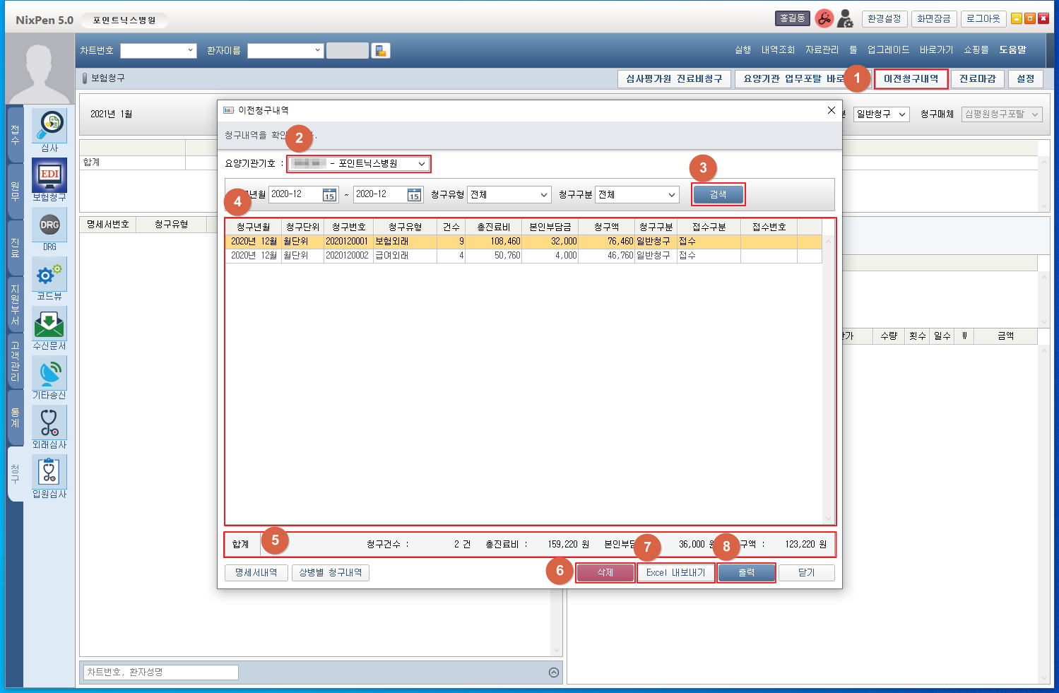 ⑦ 검색된 청구내역 목록을 엑셀 형식으로 저장합니다.