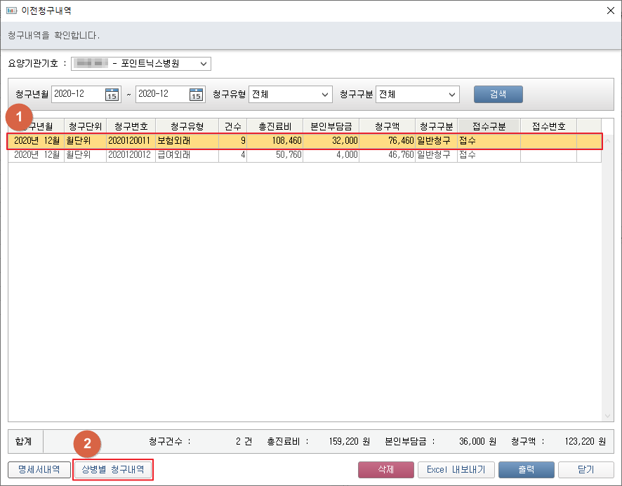 ① 상병별 청구내역을 확인할 청구내역을 선택합니다.