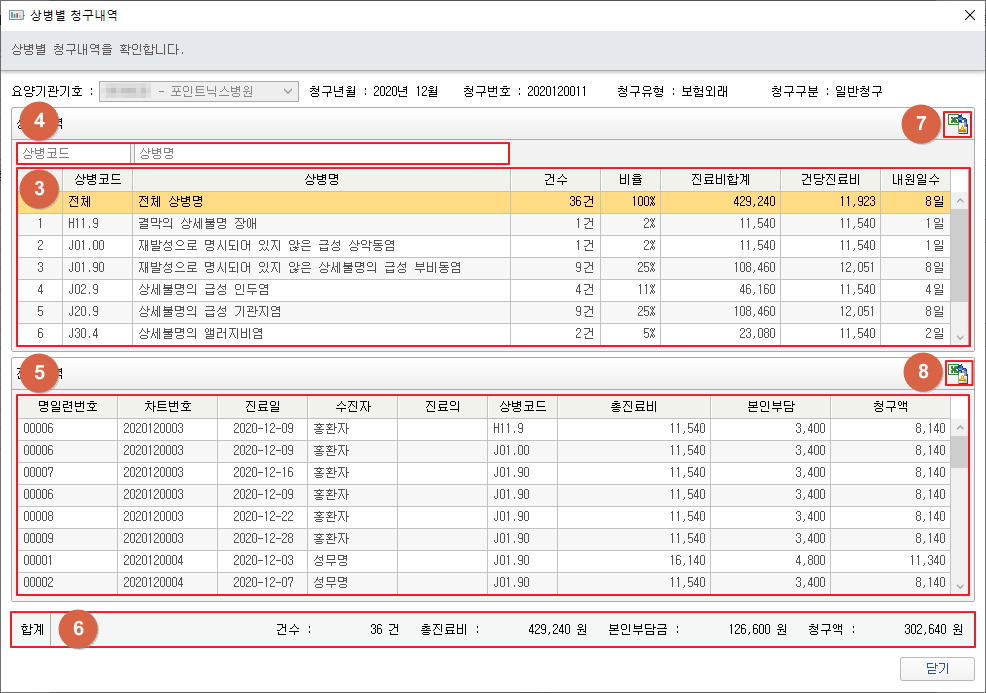 ③ 청구에 포함된 상병내역을 확인할 수 있습니다.