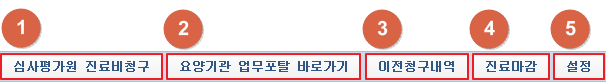 ① 건강보험심사평가원 진료비청구 프로그램을 실행합니다. ② 요양기관업무포털 사이트를 실행합니다. ③ 이전청구내역창을 팝업합니다. ④ 진료마감 설정창을 팝업합니다. ⑤ 보험청구 설정창을 팝업합니다. 1. 툴 버튼