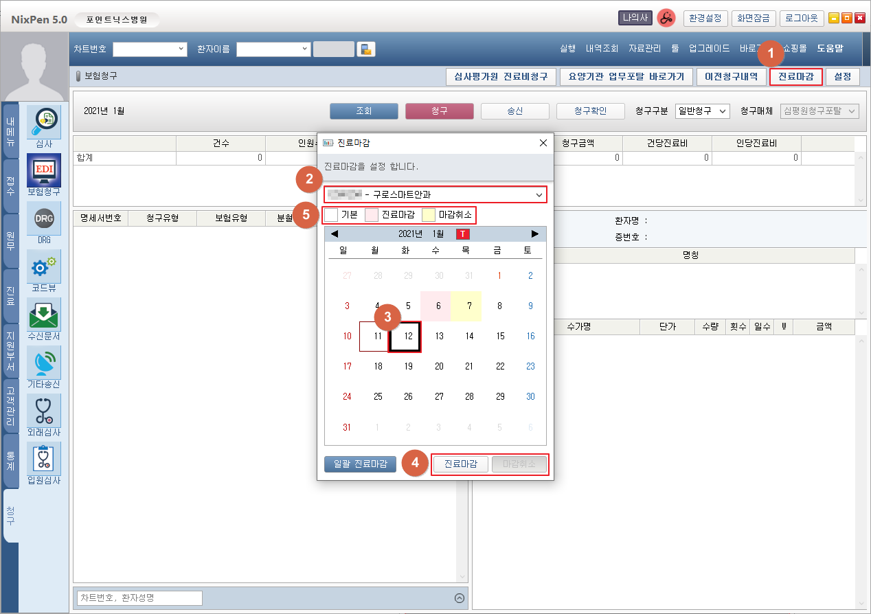 ① [진료마감] 버튼을 클릭합니다. ② 진료마감 설정할 요양기관을 선택합니다. ③ 진료마감/마감취소 할 날짜를 클릭하여 선택합니다. ④ [진료마감] 버튼을 클릭하여 선택일자를 진료마감 상태로 합니다. [마감취소] 버튼을 클릭하여 선택일자를 마감취소 상태로 합니다. ⑤ 진료마감 상태별 날짜배경색을 확인할 수 있습니다. 2. 진료마감