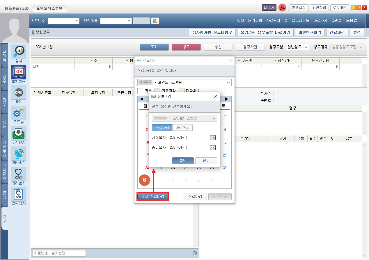 ⑥ 지정한 기간의 진료마감상태를 일괄 변경할 수 있습니다.
