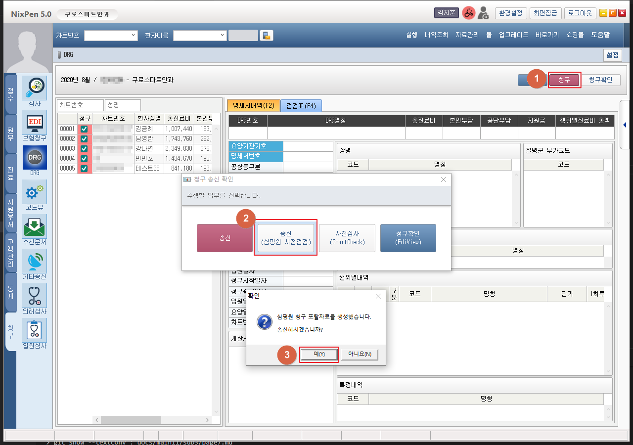 ② 청구송신 선택화면에서 [송신 (심평원 사전점검)] 버튼을 클릭합니다.