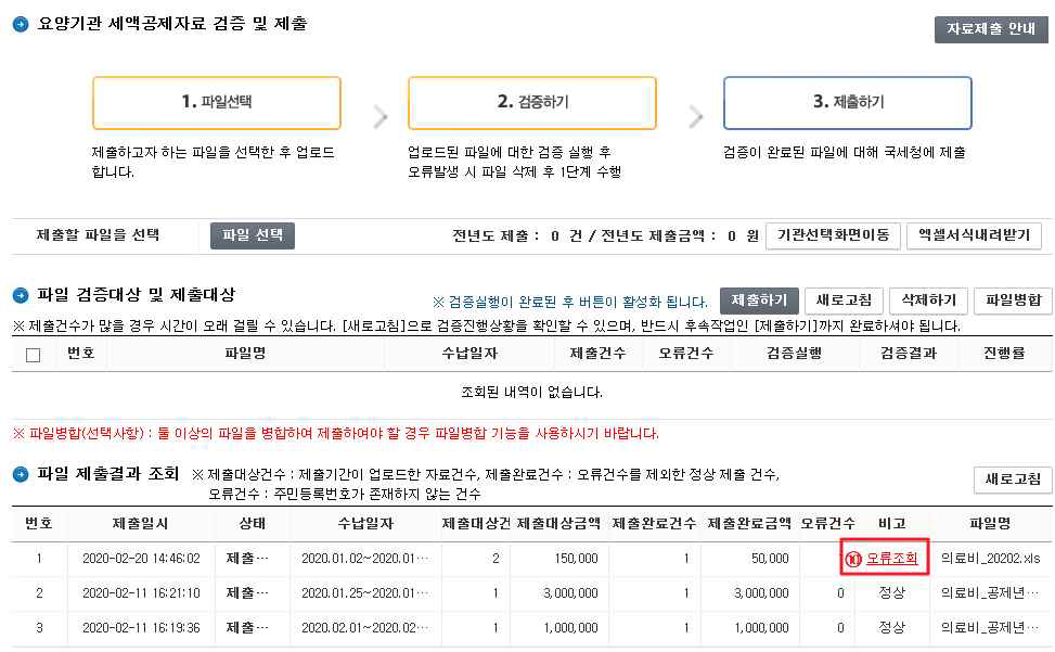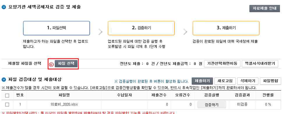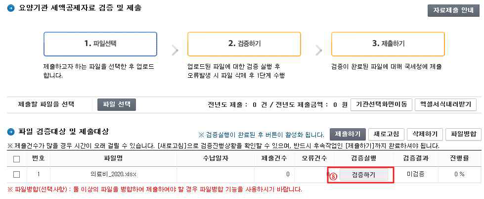 - ☞ 「⑧ 검증하기」 단계는 형식검증 단계로 주민번호 자릿수 오류, 제출한파일의 레이아웃 오류 등을 검증하며, 오류가 발생한 경우 자료 제출이불가능하므로 검증결과에서 오류조회를 클릭하여 오류를 확인 수정하여 「⑥파일선택」 단계부터 다시 수행해야 함