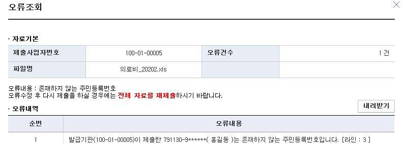 - ☞ 「⑨제출하기」 단계에서는 내용 검증 단계로 주민등록번호가 없거나 중복인경우에 오류가 발생하며 오류 건을 제외하고는 정상 제출됨