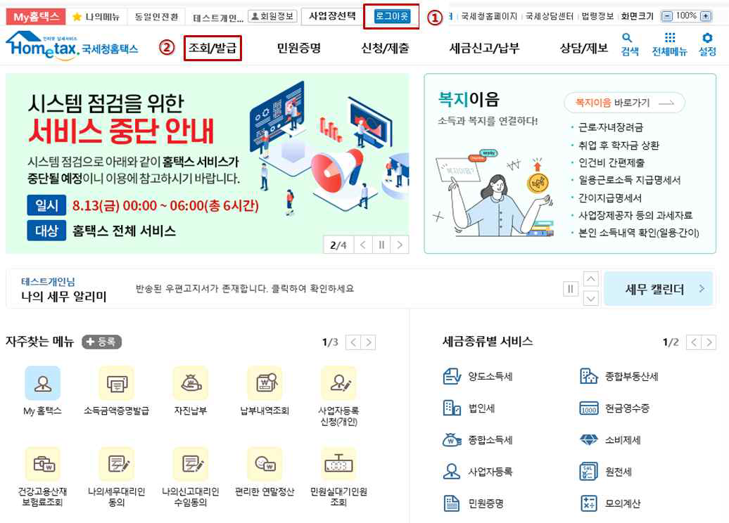 2) 「① 로그인」을 선택하여 제출할 기관의 ID로 로그인 후 「② 조회/발급」선택, 「③ 연말정산간소화」선택