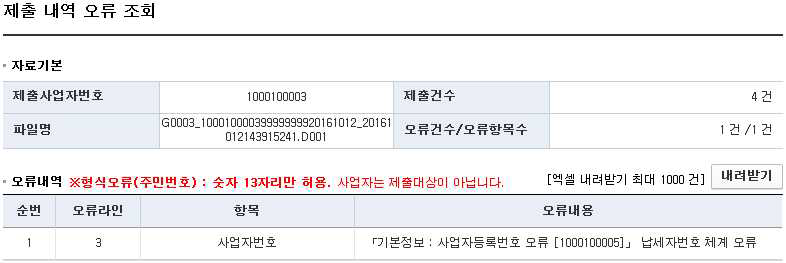 예) 제출한 자료 100건 중 오류 10건이 포함되어 이를 수정하여 다시 제출할 경우