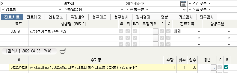 진찰료(재진) + AH240 대면진료 관리료 + 기타 원외처방 (코로나19 치료목적 약품) - 특정내역 MT043 / MX999 자동 기재 되오니 별도 입력 과정 없음 |