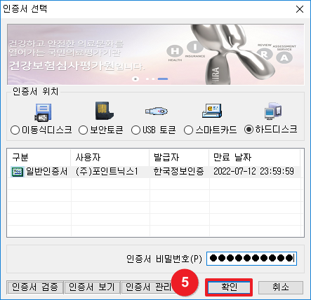 ⑤ [확인] 버튼 클릭하여 인증서 로그인