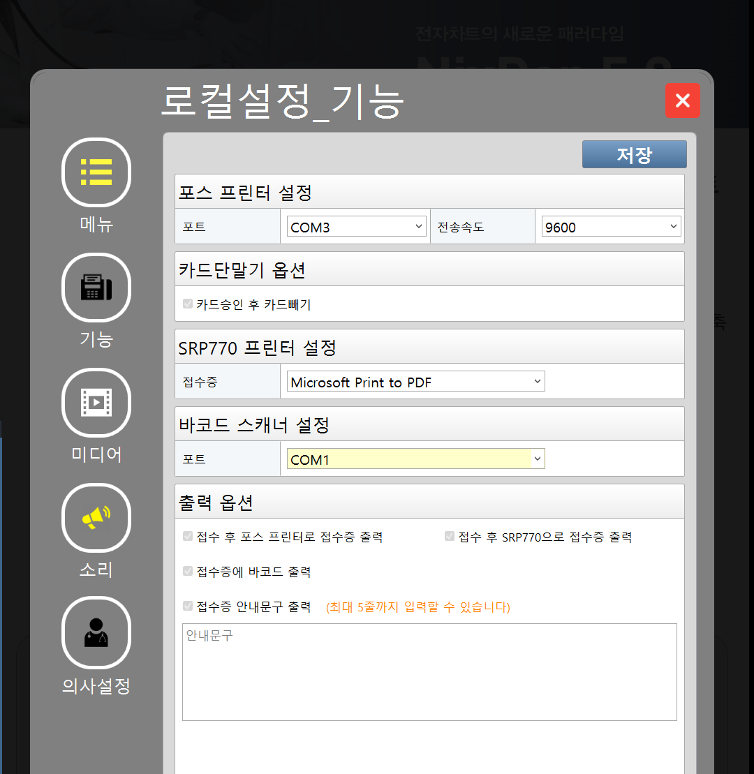 - 키오스크 기능 로컬 설정에서 바코드 스캐너 포트 옵션 설정