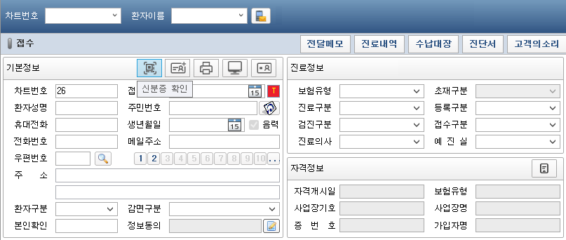 - 접수 화면의 환자 기본 정보에 신분증 확인 버튼이 표시됩니다.