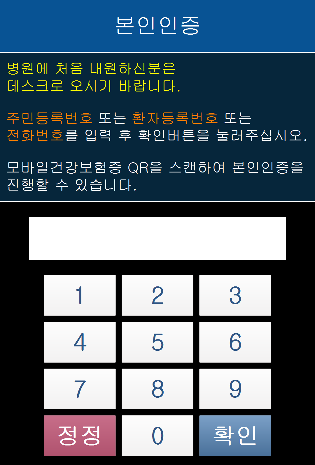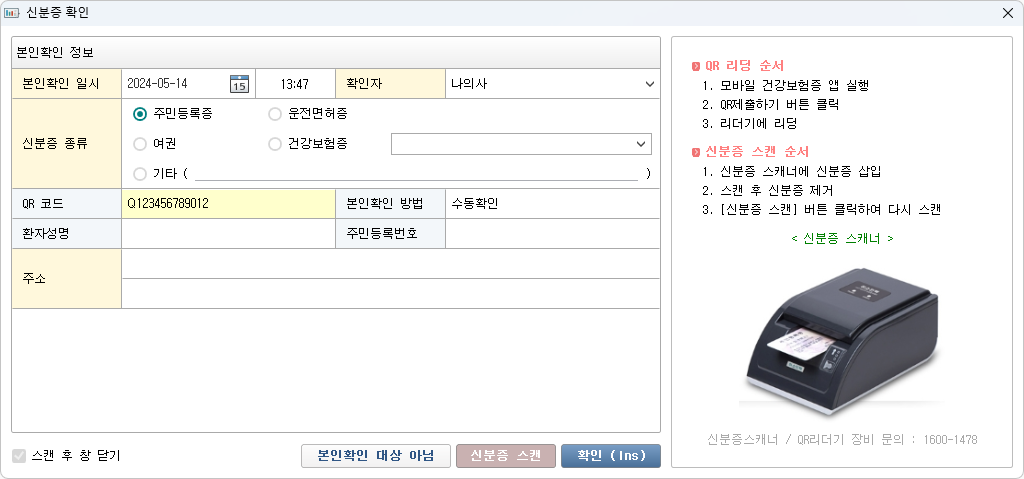 - 건강보험증 QR 코드를 리더기로 읽거나, 신분증 스캐너에 신분증(주민등록증, 운전면허증)를 삽입하여 인증을 진행합니다.