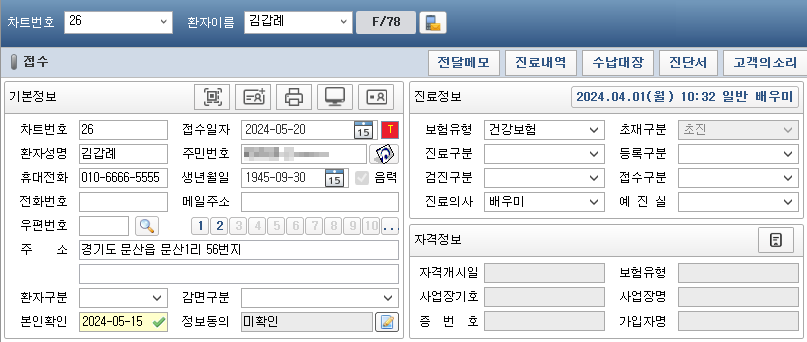 - 접수 화면에서 환자를 불러온 후 자격 조회를 수행합니다.