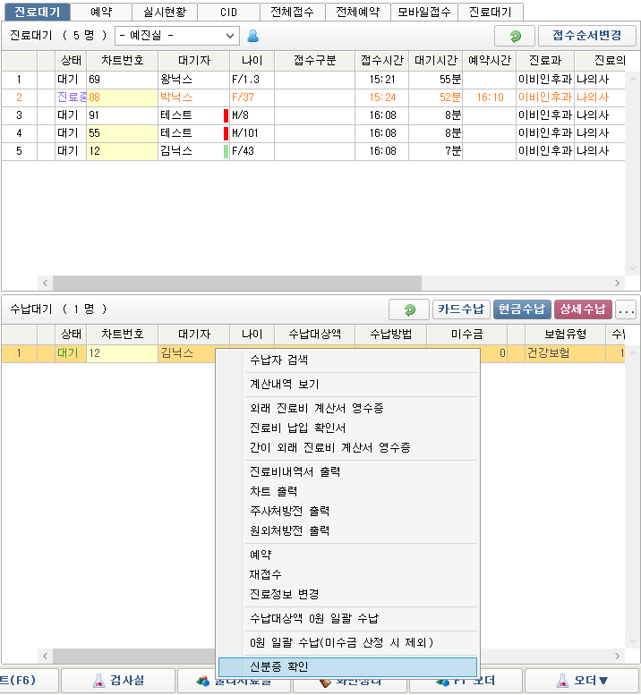 - 대상 환자 우클릭 후 신분증 확인 을 진행할 수 있습니다.