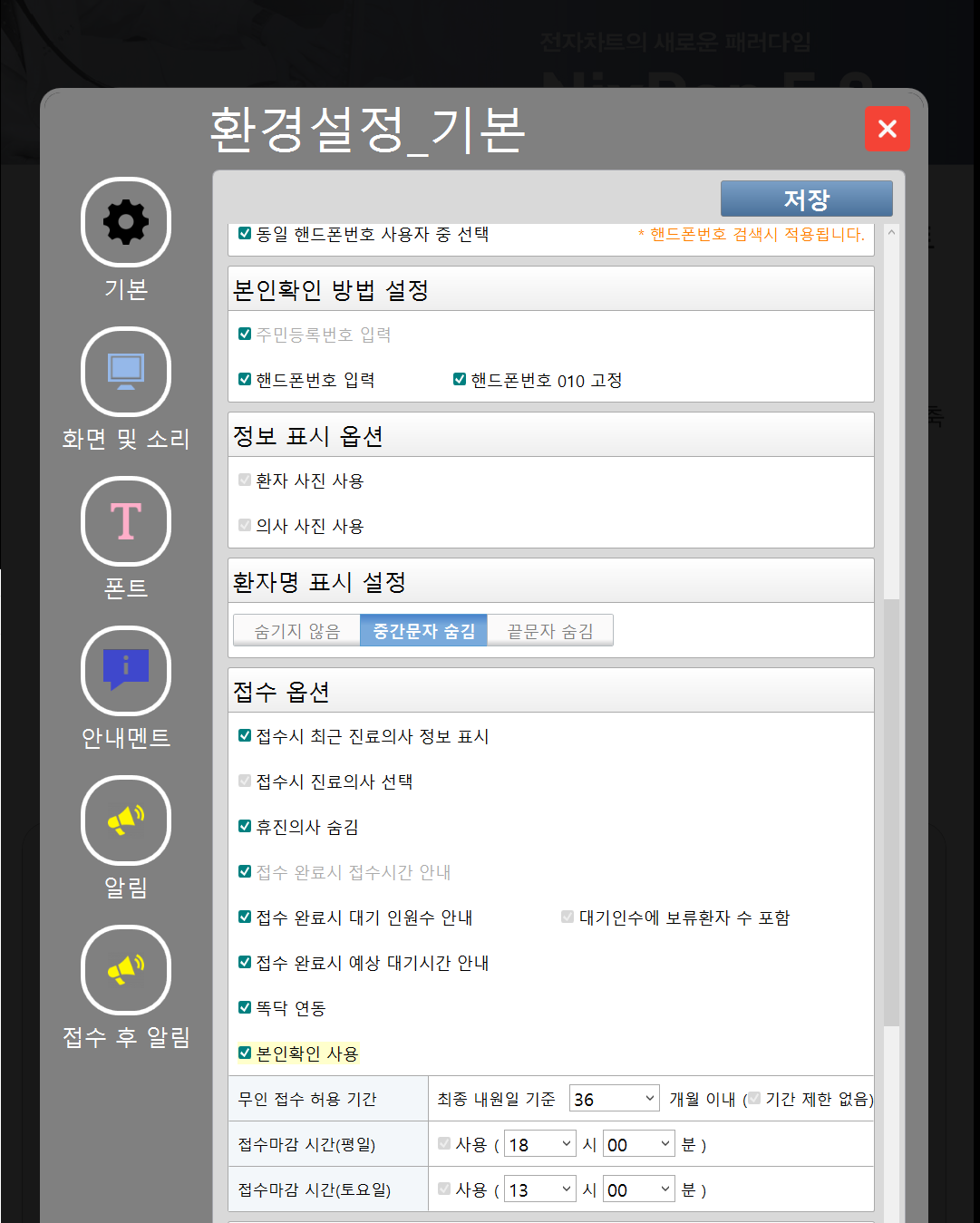 - 키오스크 접수 환경 설정에서 본인 확인 사용 옵션 설정