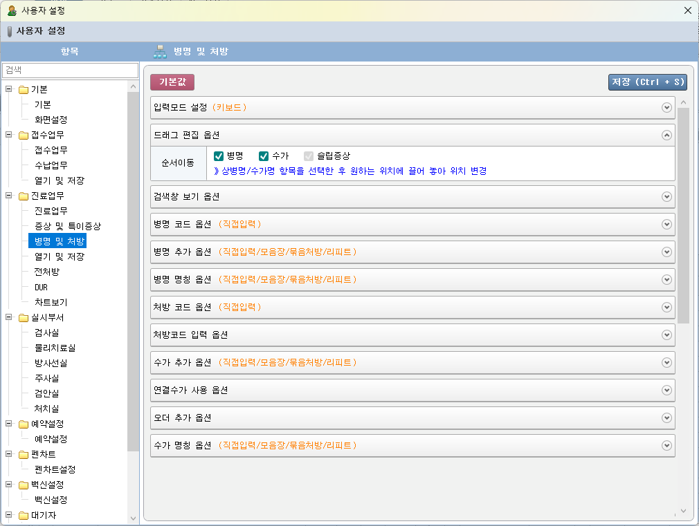 - 병명 및 처방 사용자 설정에서 순서 이동 (병명, 수가, 슬립증상) 옵션을 설정합니다.