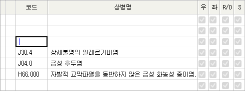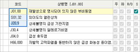 ▲ 첫 번째 줄 J01.00 부터 세 번째 줄 J20.9 상병 선택