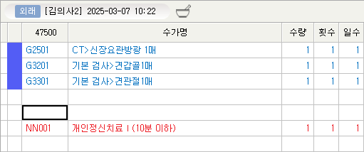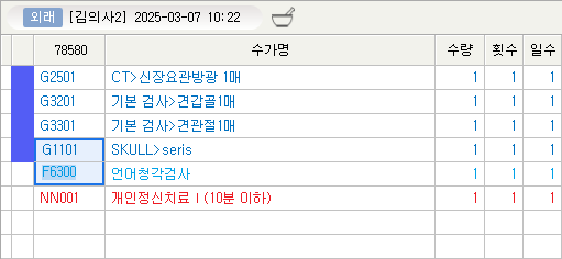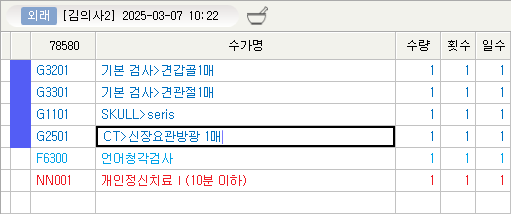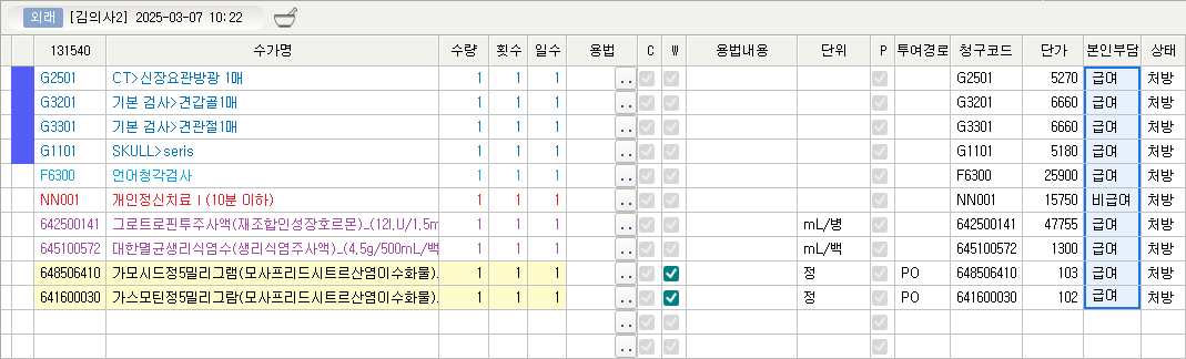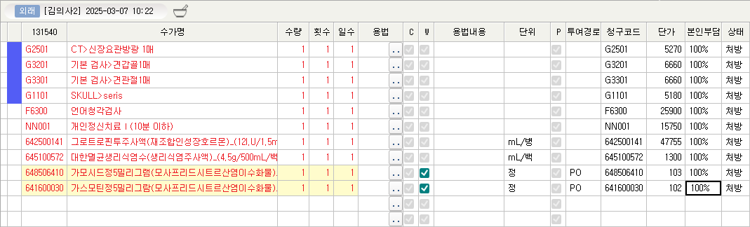 ▲ 첫 번째 줄 G2501 검사부터 열 번째 줄 641600030 내복약 선택
