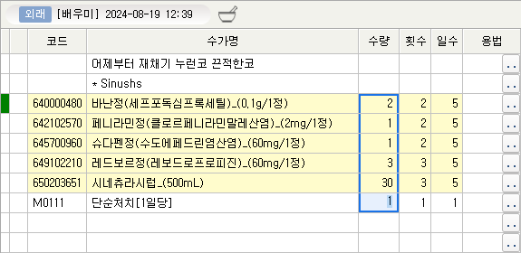 - 수량/횟수/일수/용법코드/본인부담 드래그하여 선택한 후 일괄 적용