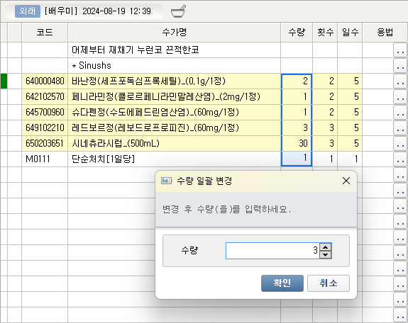 ① 처방 창 수량/횟수/일수 에서 마우스를 끌어 여러 건을 선택하면 일괄 변경 창이 팝업됩니다.