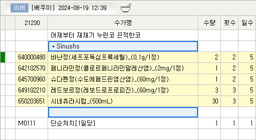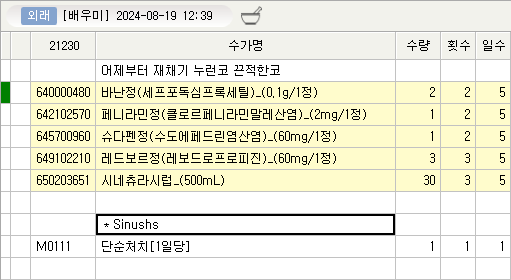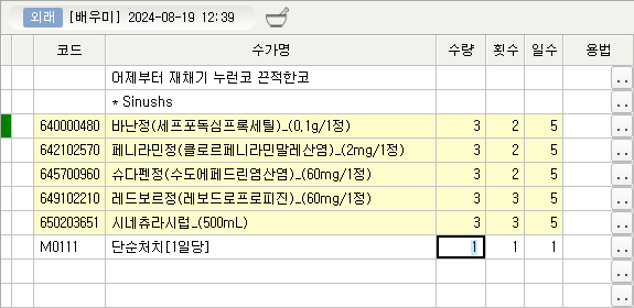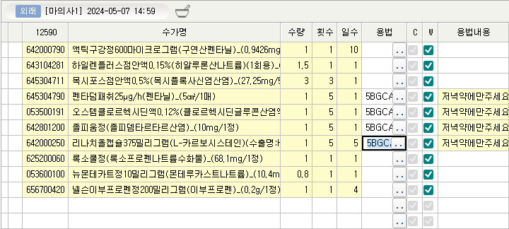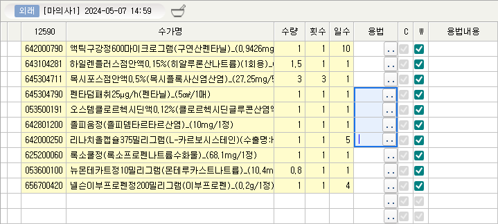 ▲ 두 번째 줄 640000480 내복약부터 여덟 번째 줄 MM010 수가 선택