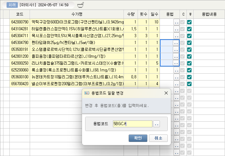 ② 처방 창 용법 에서 마우스를 끌어 여러 건을 선택하면 일괄 변경 창이 팝업됩니다.