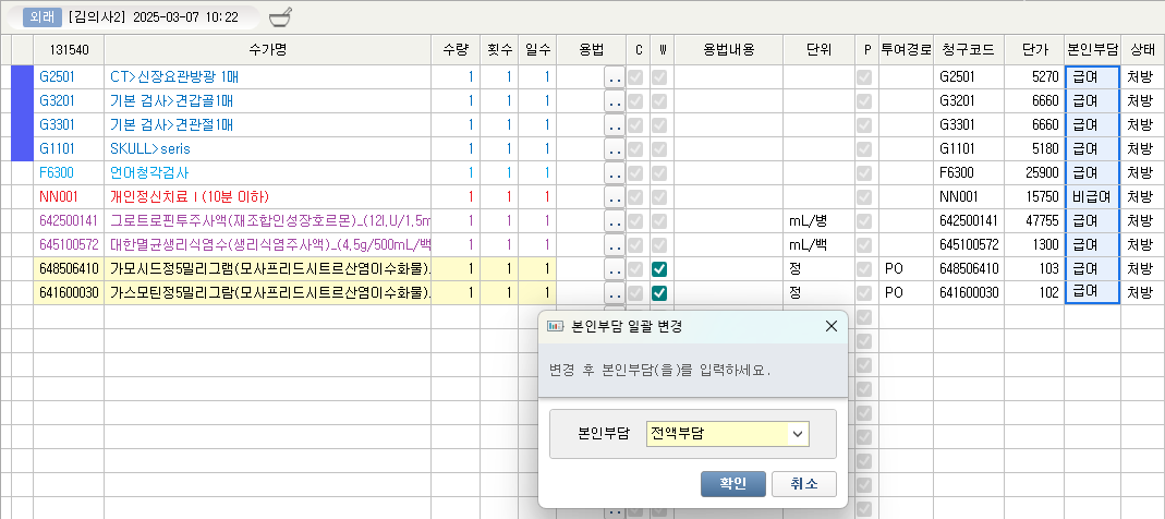 ③ 처방 창 본인부담 에서 마우스를 끌어 여러 건을 선택하면 일괄 변경 창이 팝업됩니다.