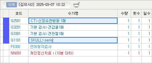 ② 처방 창에서 수가명 을 선택한 후 마우스를 끌어 다른 줄로 위치를 변경합니다.