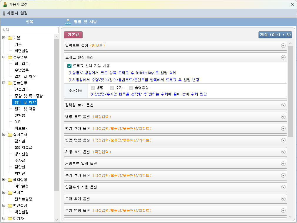 - 병명 및 처방 사용자 설정에서 드래그 선택 기능 사용 옵션을 설정합니다.
