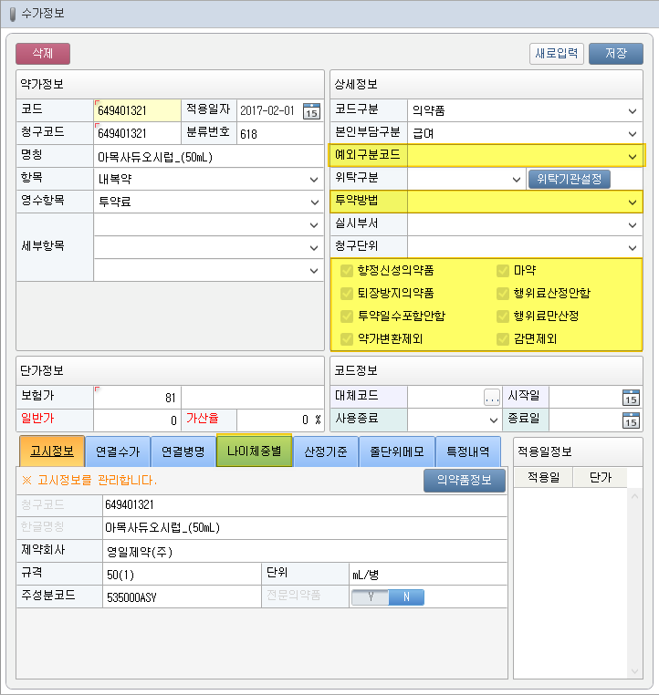 1) 코드별 나이/체중 처방 설정 지원 2) 산정기준 조건 추가 3) 줄단위메모 자동 생성 기능 4) 특정내역 자동 추가 기능