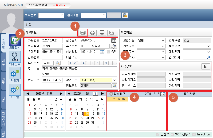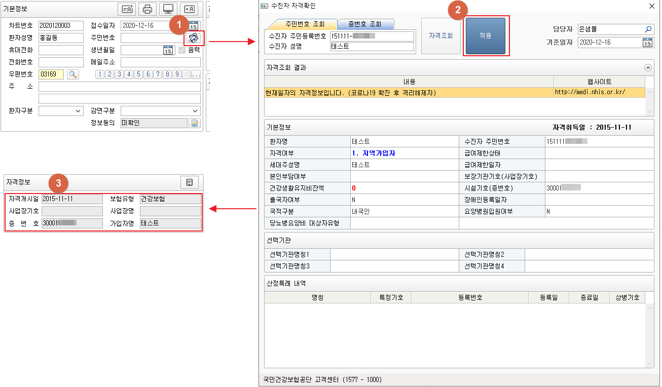 자동자격조회 사용이 설정되어있는 경우 주민번호 입력 후 엔터 시 자격조회가 수행됩니다.