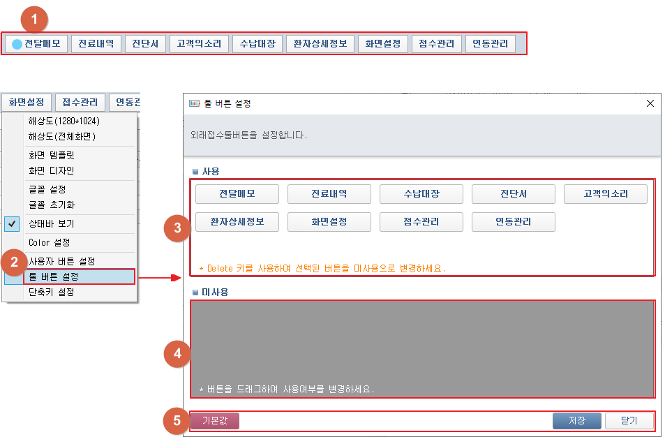 ① 화면 상단의 툴버튼을 통해 각 기능에 접근이 가능합니다. ② 툴 버튼 [화면설정] 클릭 후 [툴 버튼 설정] 메뉴 클릭 시 툴 버튼 설정창이 팝업됩니다. ③ 사용하지 않는 버튼을 미사용영역으로 드래그하여 해당 버튼을 미사용으로 변경할 수 있습니다. 사용영역에서 버튼 선택 후 Delete키를 눌러 해당 버튼을 미사용으로 변경할 수 있습니다. ④ 사용하는 버튼을 사용영역으로 드래그하여 해당 버튼을 사용으로 변경할 수 있습니다. ⑤ [기본값] 버튼을 클릭하여 툴버튼 설정을 기본값으로 저장할 수 있습니다. [저장] 버튼 클릭 시 변경된 툴버튼의 사용여부를 저장합니다. [닫기] 버튼 클릭 시 변경사항을 저장하지 않고 창을 닫습니다. 1. 툴 버튼 설정