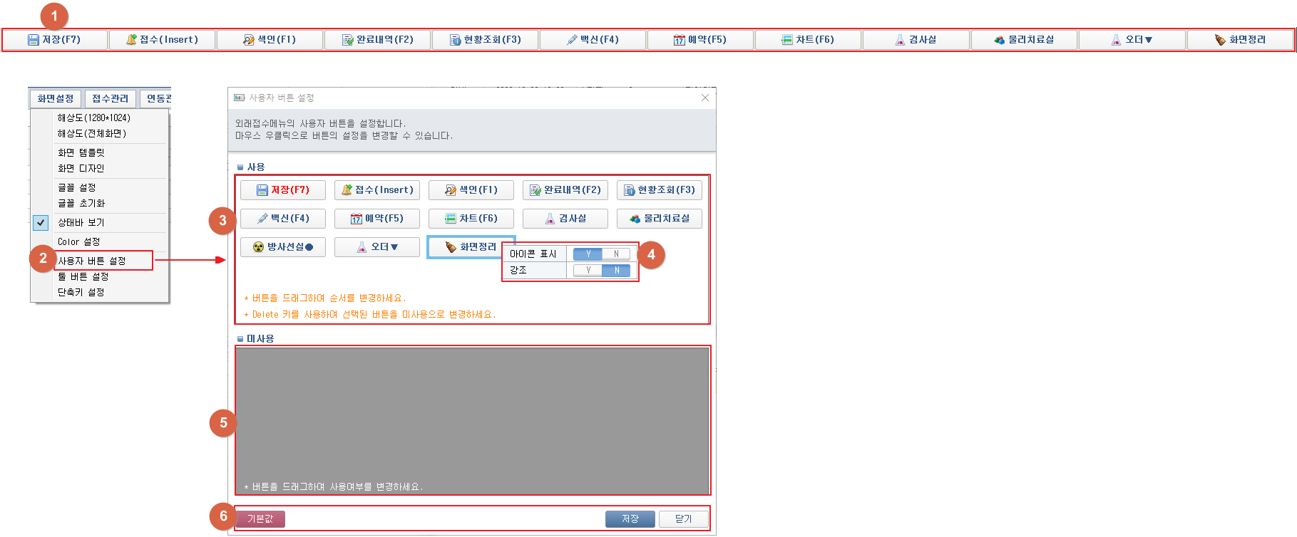 ① 화면 하단의 사용자 버튼을 통해 각 기능에 접근이 가능합니다. ② 툴 버튼 [화면설정] 클릭 후 [사용자 버튼 설정] 메뉴 클릭 시 사용자 버튼 설정 창이 팝업됩니다. ③ 사용하지 않는 버튼을 미사용영역으로 드래그하여 해당 버튼을 미사용으로 변경할 수 있습니다. 사용영역 내에서 원하는 위치로 드래그하여 버튼순서를 변경할 수 있습니다. 사용영역에서 버튼 선택 후 Delete키를 눌러 해당 버튼을 미사용으로 변경할 수 있습니다. ④ 버튼을 우클릭하여 아이콘 표시여부와 강조 여부를 선택할 수 있습니다. ⑤ 사용하는 버튼을 사용영역으로 드래그하여 해당 버튼을 사용으로 변경할 수 있습니다. ⑥ [기본값] 버튼을 클릭하여 사용자 버튼 설정을 기본값으로 저장할 수 있습니다. [저장] 버튼 클릭 시 변경된 사용자 버튼의 사용여부를 저장합니다. [닫기] 버튼 클릭 시 변경사항을 저장하지 않고 창을 닫습니다. 2. 사용자 버튼 설정