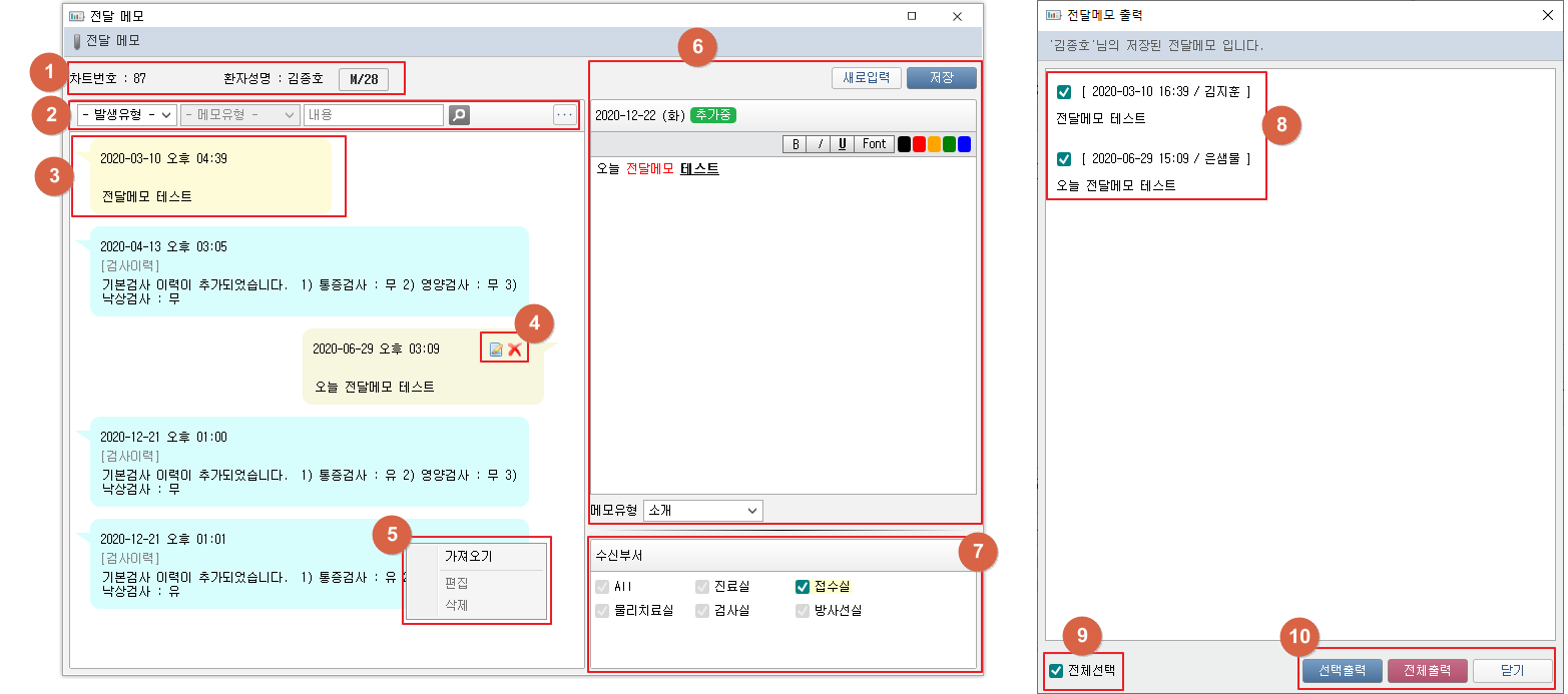 ① 툴 버튼의 [전달메모] 버튼 클릭 시 전달메모 창이 팝업됩니다. 환자정보를 확인할 수 있습니다. ② 검색조건에 따라 전달메모를 검색할 수 있습니다. ③ 전달메모는 발생유형에 따라 사용자/시스템 전달메모로 나뉘어집니다. 사용자 전달메모는 노란 말풍선으로 표시됩니다. 시스템 전달메모는 파란 말풍선으로 표시됩니다. 말풍선을 더블클릭 하여 메모 입력란으로 전달메모를 가져올 수 있습니다. ④ 사용자 전달메모는 해당 버튼을 통해 편집/삭제가 가능합니다. ⑤ 말풍선을 우클릭하여 전달메모를 가져오거나 편집 또는 삭제할 수 있습니다. 시스템 전달메모는 편집/삭제가 불가능합니다. ⑥ [새로입력] 버튼을 클릭하여 전달메모를 새로입력할 수 있습니다. [저장] 버튼을 클릭하여 전달메모의 변경사항을 저장합니다. ⑦ 수신받을 부서를 선택할 수 있습니다. ⑧ [...] 버튼 클릭 시 전달메모 출력창이 팝업됩니다. 출력할 전달메모를 선택합니다. ⑨ 전달메모를 전체 선택하거나 해제 할 수 있습니다. ⑩ [선택출력] 클릭 시 선택된 전달메모만 출력합니다. [전체출력] 클릭 시 전체 전달메모를 출력합니다. 출력 시 미리보기 창이 팝업됩니다. 4. 전달메모