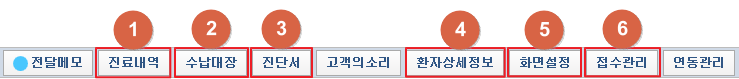 ① [진료내역] 버튼 클릭 시 진료내역 화면이 창으로 팝업됩니다. ② [수납대장] 버튼 클릭 시 수납대장 화면이 창으로 팝업됩니다. ③ [진단서] 버튼 클릭 시 서류발급 화면이 창으로 팝업됩니다. ④ [환자상세정보] 버튼 클릭 시 환자상세정보 창이 팝업됩니다. ⑤ [화면설정] 버튼 클릭 시 화면설정 관련 기능과 연결되는 컨텍스트메뉴가 열립니다. ⑥ [접수관리] 버튼 클릭 시 접수관련 기능과 연결되는 컨텍스트메뉴가 열립니다. 3. 툴 버튼