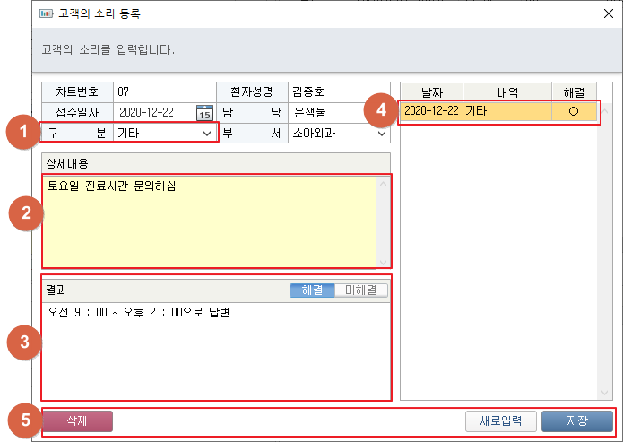 ① 툴 버튼의 [고객의 소리] 버튼 클릭 시 고객의 소리 등록 창이 팝업됩니다. ② 상담내용을 입력합니다. ③ 결과의 해결여부를 버튼을 클릭하여 선택합니다. 결과 내용을 기입합니다. ④ 저장된 고객의 소리가 목록으로 표시됩니다. ⑤ [삭제] 버튼 클릭 시 선택된 고객의 소리가 삭제됩니다. [새로입력] 버튼 클릭 시 새로운 고객의 소리를 입력할 수 있습니다. [저장] 버튼 클릭 시 입력된 내용을 저장합니다. 5. 고객의 소리