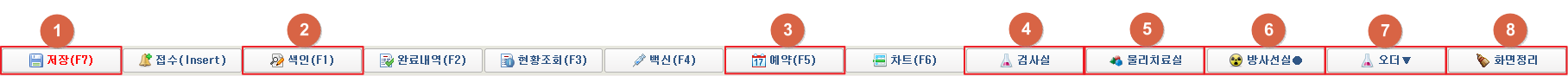 ① [저장] 버튼 클릭 시 환자정보가 저장됩니다. ② [색인] 버튼 클릭 시 환자 선택 창이 팝업됩니다. ③ [예약] 버튼 클릭 시 예약 화면이 창으로 팝업됩니다. ④ [검사실] 버튼 클릭 시 검사실 화면이 창으로 팝업됩니다. ⑤ [물리치료실] 버튼 클릭 시 물리치료실 화면이 창으로 팝업됩니다. ⑥ [방사선실] 버튼 클릭 시 방사선실 화면이 창으로 팝업됩니다. ⑦ [오더] 버튼 클릭 시 오더 창이 팝업됩니다. ⑧ [화면정리] 버튼 클릭 시 조회된 환자가 초기화됩니다. 6. 사용자 버튼