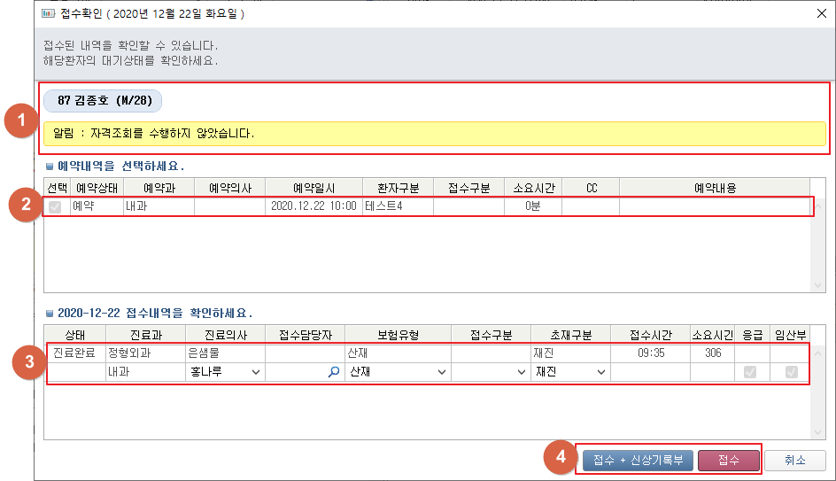 ① [접수] 버튼 클릭 시 접수관리 창이 팝업됩니다. 환자정보와 알림, 주의사항을 확인할 수 있습니다. ② 환자의 예약내역을 확인할 수 있습니다. 예약 선택 후 접수 시 해당 예약내역에 대해 접수할 수 있습니다. ③ 환자의 접수내역을 확인할 수 있습니다. 접수 내용을 변경할 수 있습니다. ④ [접수 + 신상기록부] 버튼 클릭 시 접수와 동시에 신상기록부가 즉시 출력됩니다. [접수] 버튼 클릭 시 접수됩니다. 7. 접수