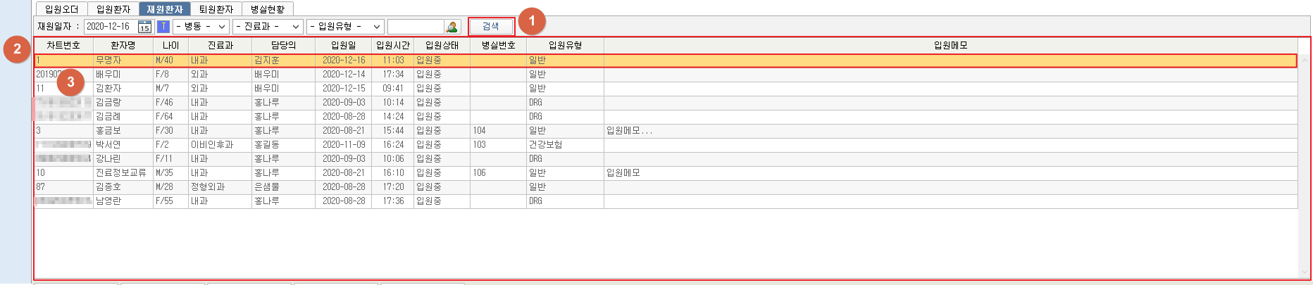② 검색 조건에 해당하는 재원환자 목록을 확인할 수 있습니다.