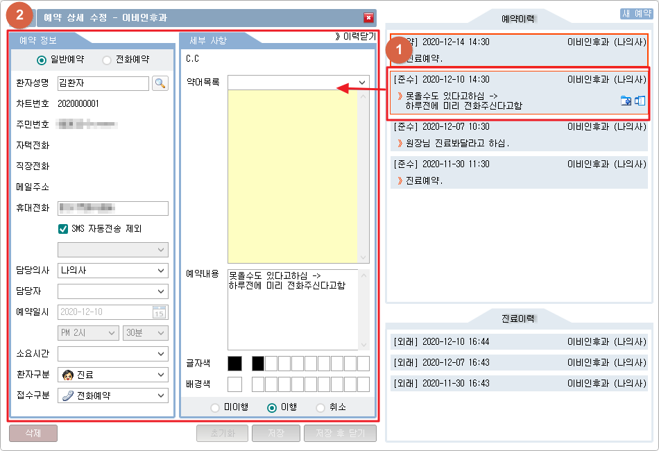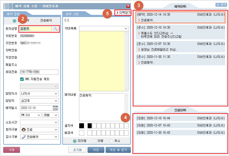 ③ 선택 환자의 예약 이력을 확인할 수 있습니다.