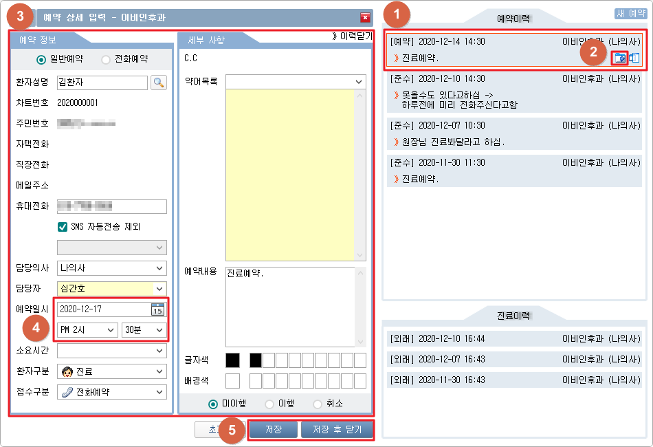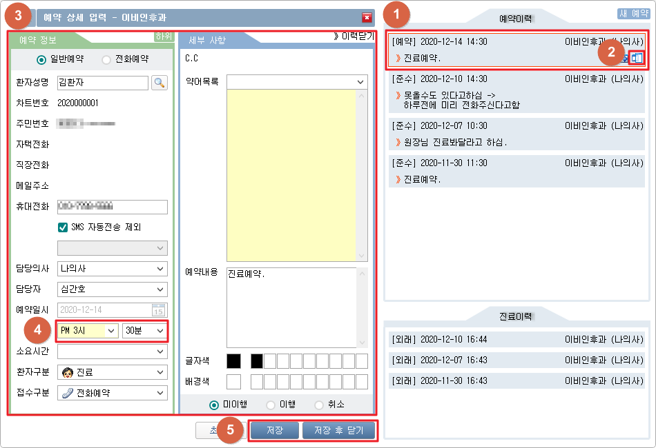 ① 복사하고자 하는 이력에 마우스를 위치시킵니다. ② [ 3. 이력복사 ]버튼을 클릭합니다. ③ 복사된 예약 정보를 확인합니다. ④ 예약일시를 확인 및 변경합니다. ⑤ [저장] 또는 [저장 후 닫기] 버튼을 클릭합니다.