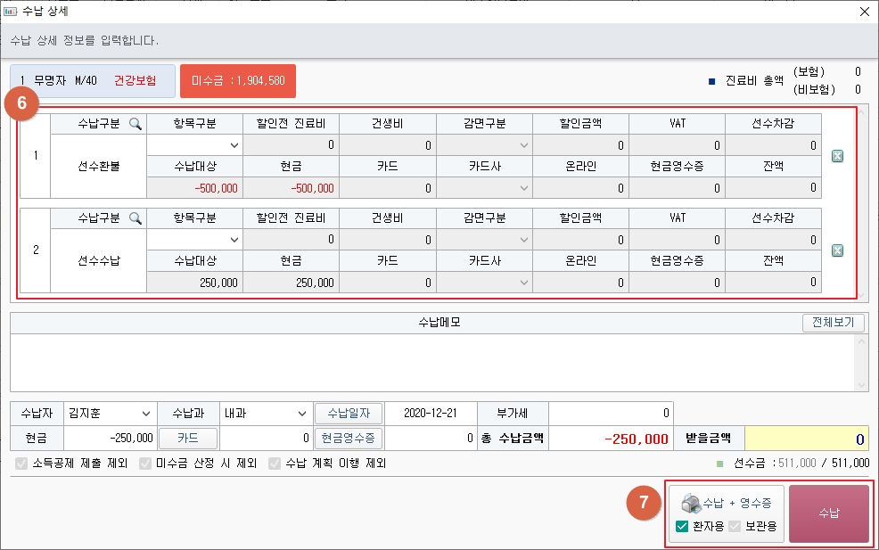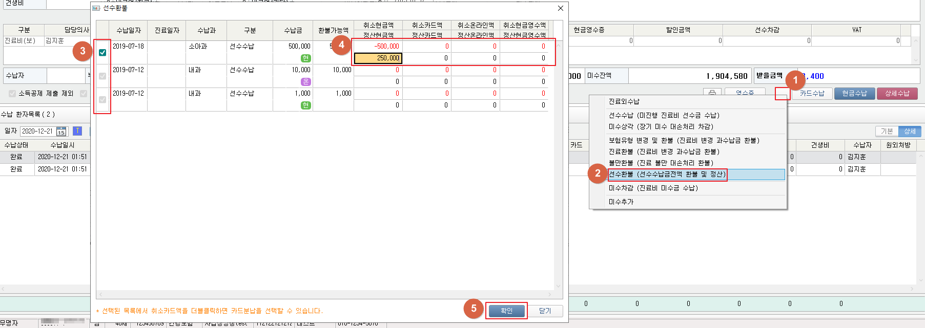 ① [...] 버튼을 클릭합니다. ② 기 수납한 선수금에 대하여 환자가 환불을 요청할 경우 [선수환불 (선수수납금전액 환불 및 정산)] 버튼을 클릭합니다. ③ 환불할 선수금 수납내역을 선택합니다. ④ 정산받을 금액을 입력합니다. ⑤ [확인] 버튼을 클릭합니다. ⑥ 환불 및 정산 내역을 확인합니다. ⑦ [수납+영수증] 버튼을 클릭하면 수납내역을 저장 후 영수증을 출력할 수 있습니다. [수납] 버튼을 클릭하면 수납내역을 저장합니다. 1. 선수환불