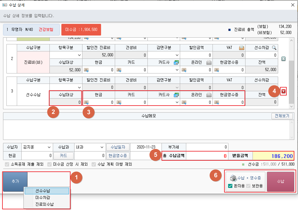 [수납] 버튼을 클릭하면 수납내역을 저장합니다.