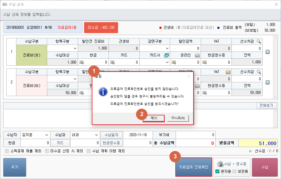 ① 보험구분이 의료급여인 환자를 수납할 경우 알림창이 나타납니다.