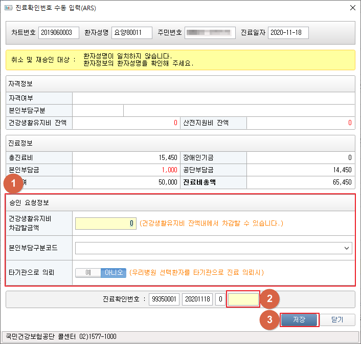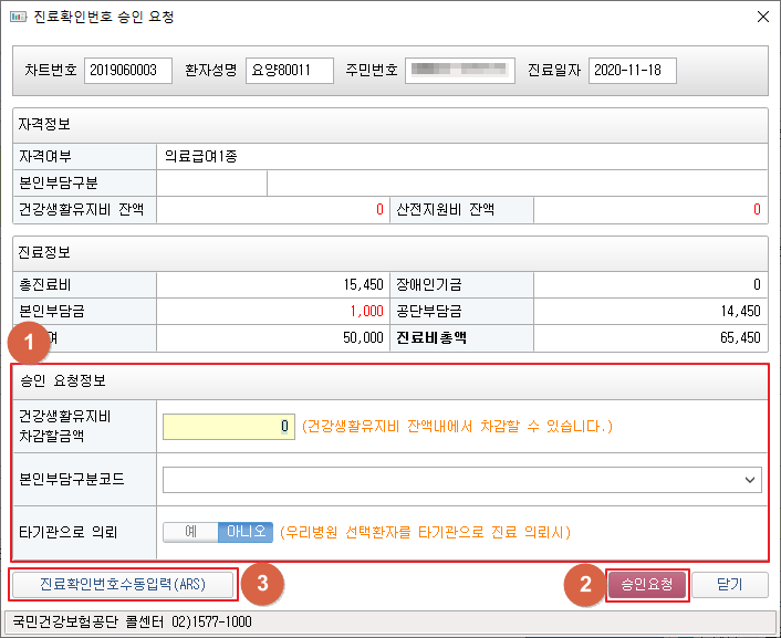 ③ 수동으로 입력할 경우 [진료확인번호수동입력(ARS)] 버튼을 클릭합니다.