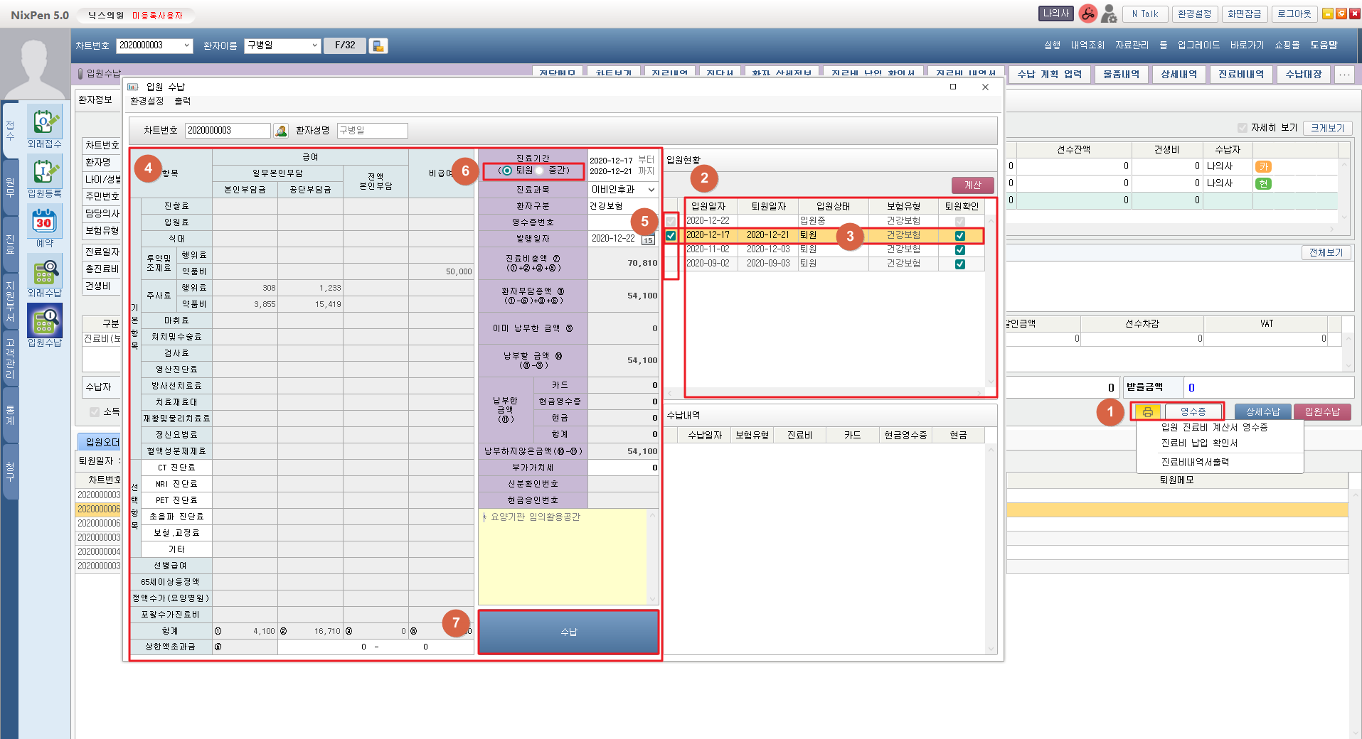 ] 체크박스로 표시합니다. ⑥ 입원상태에 따른 영수증 유형을 확인합니다. ⑦ [수납] 버튼을 클릭하여 수납을 진행합니다.