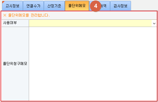 ① 고시정보를 확인할 수 있습니다. 내용을 변경할 수 없습니다. 2. 추가정보 탭 ② 연결수가 항목이 표시됩니다. [추가] 버튼 클릭 시 약수가 검색 창이 팝업됩니다. [제거] 버튼 클릭 시 목록에서 선택된 연결수가를 제거합니다. 우측하단의 순서변경 버튼을 사용하여 순서를 변경할 수 있습니다.