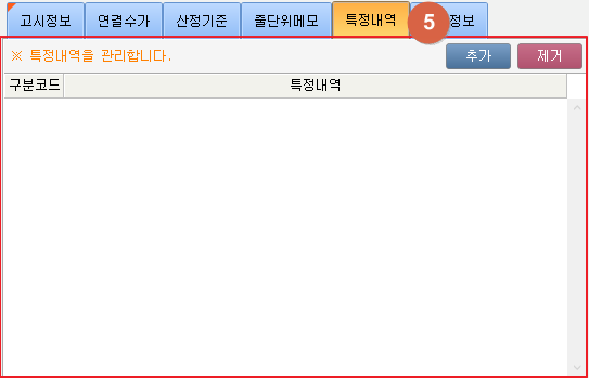 ⑤ 특정내역을 관리할 수 있습니다. [추가] 버튼 클릭 시 특정내역 선택 창이 팝업됩니다. [제거] 버튼 클릭 시 목록에서 선택된 특정내역을 제거합니다.