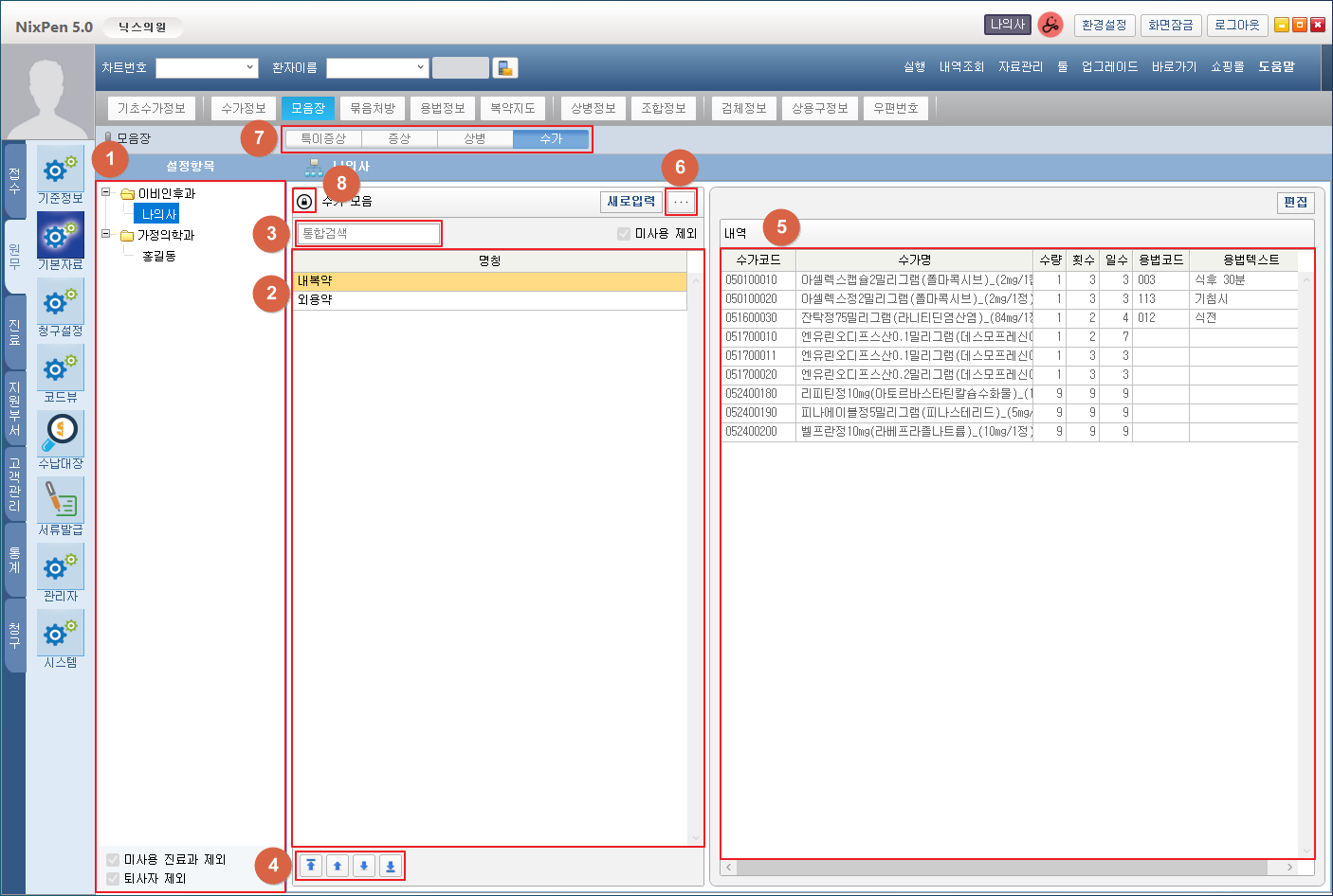 ⑤ 선택한 수가그룹에 포함된 수가목록을 표시합니다.
